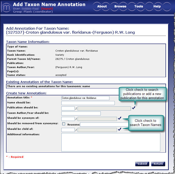 access the Taxon Name Search/Select table. - Additional information: Enter more text here if needed to explain the annotation.