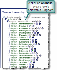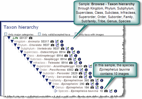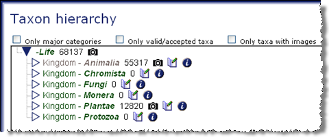 By left-clicking on the name of the Kingdom, the tree is expanded to reveal all levels below that Kingdom. To the right of each name is a number which indicates the approximate number of images in that category along with several icons. If images are available, the camera icon