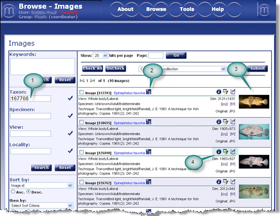 : From the above Browse - Taxon hierarchy page, a list of images is displayed when the camera icon