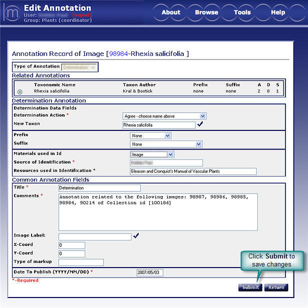 Edit Annotation contains the previously entered annotation data that can be edited by the owner (only available if the annotation is not yet published.)