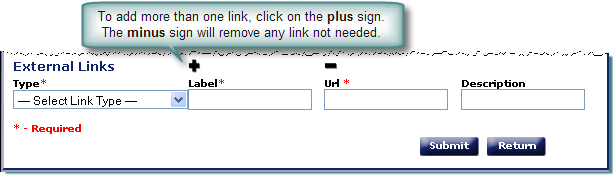 8. To add more than one external link, click on the plus sign. The minus sign will remove any link not needed.