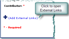 2. After clicking on the edit icon, go to the bottom of the Edit screen and click on the blue highlighted text "Add External Links." This will bring up the external links submit/edit form as seen below. A Contributor/Submitter will supply external links in this same place during the submitting process, if submitting through the web interface.