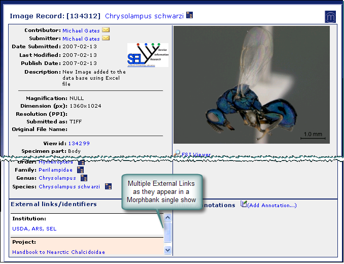 Morphbank provides an option to link deposited images to any external link (link to a site outside Morphbank) and link any site back to Morphbank (internal link).
