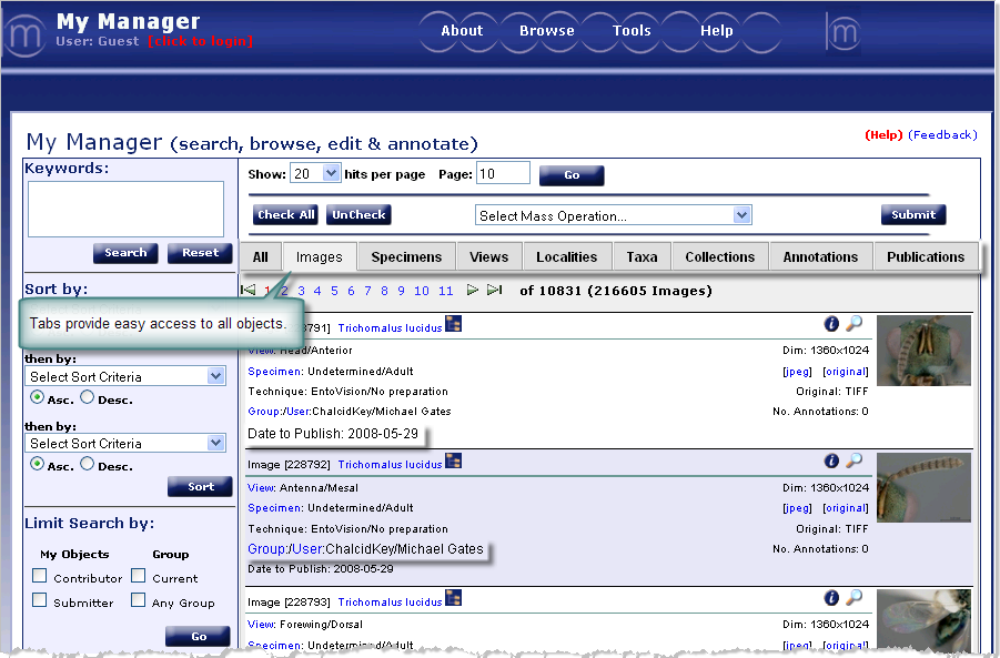 Everyone uses this My Manager interface -- the public and those with Morphbank accounts. The general public uses My Manager tabs to browse all the objects in Morphbank that are visible to the public. In Morphbank terms, the public sees only images that are published.