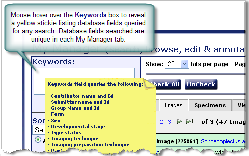 Easy to use, simply check the desired box and click Go. This feature may be used alone or in combination with a Keyword search. For example, in the Images tab of My Manager, upon checking Contributor and clicking Go, a Morphbank user will see only those images they have have contributed. If, in addition, they add a search term to Keywords, and leave the Contributor box checked, the search will be: Find all objects that have the search term AND have been contributed by this user.
