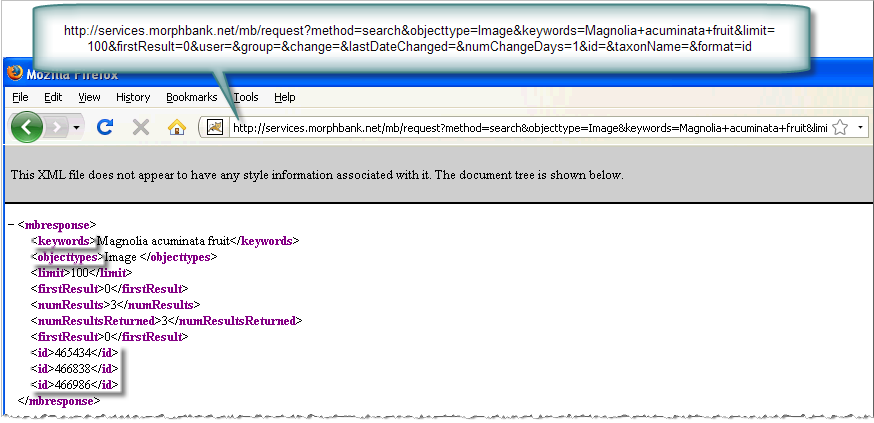 In the above example, a user wants to find out if Morphbank has any images of Magnolia acuminata fruit. The search request via services returns 3 Image Ids. On any web site the user may be building, these ids can be embedded in any web pages to construct a dynamic URL link to the images. For the 3 Ids returned, the user can construct links to the data about the image or to the image itself as shown in the following URLs. Note the formats of the URLs.- http://www.morphbank.net/?id=466838