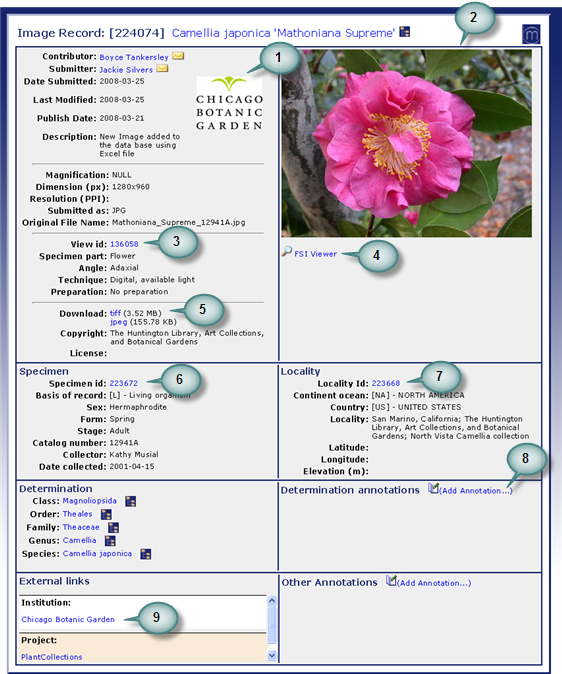 - List of published determination annotations associated with this image. Clicking on the information button will access the annotation. Unpublished determination annotations will not be listed. Click on Add Annotation to add one, if desired.