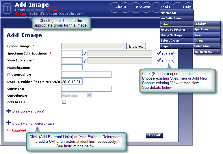 The data entered on the Add Image screen provides information about the image to upload, the specimen to which the image belongs, and its view. Both a specimen and a view should exist before uploading an image. If not previously added, provisions have been made on this screen to add a specimen and a view.
