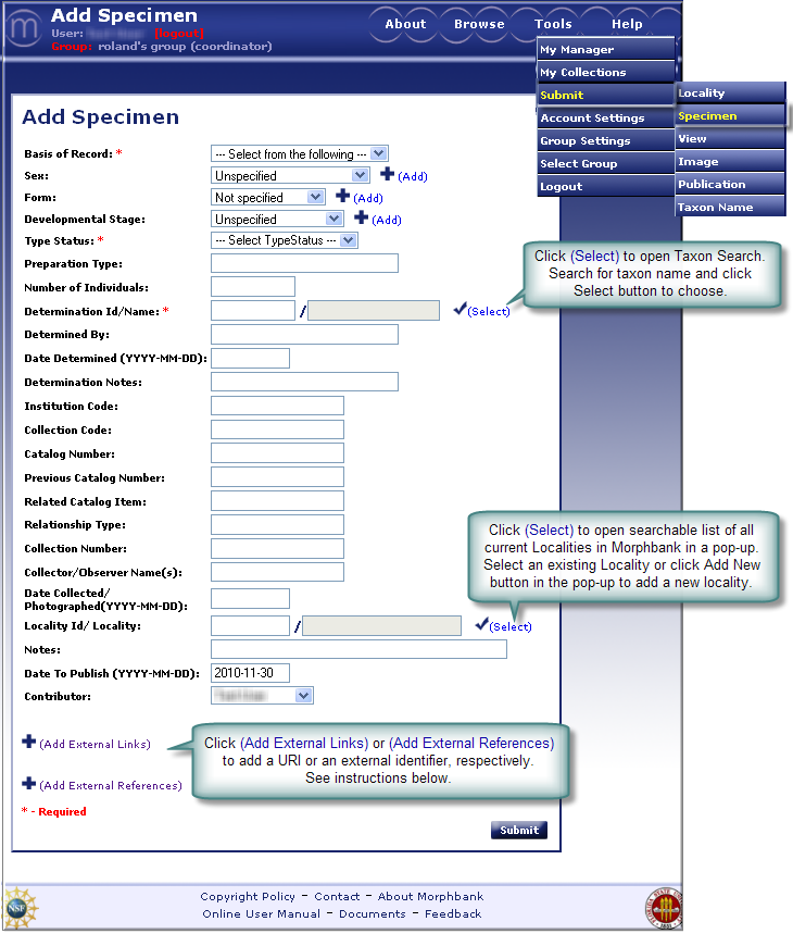 Select the name of the contributor (person having the authorization to release the images) from the dropdown list. The contributor can be different from the submitter (person entering the data). If you need to add new entries to this list, please contact mbadmin at scs dot fsu dot edu. - Add External Links to this record. For complete