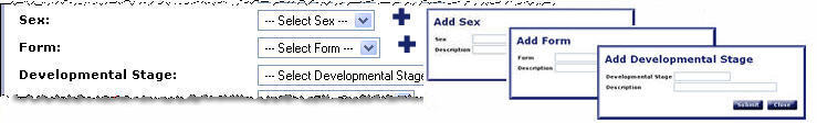 Choose one of the options from the drop-down list. Choices are: Observation, Living Organism, Specimen, Germplasm /Seed. The list of options is based on the Darwin Core standard http://darwincore.calacademy.org/. Basis of Record is defined as: A descriptive term indicating whether the record represents an object or observation. Another definition reads: The nature of the sample. If additional options are needed, please contact mbadmin at scs dot fsu dot edu. - Sex, Form, Developmental Stage