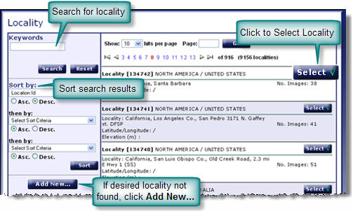 If the desired locality/id is not on the Locality screen, click on the Add New button to add a Locality. Once the fields are populated, click Submit to Add the new Locality and the user will be prompted to click "Select" to auto-fill the Locality field and may then continue with the Add Specimen screen. - Notes
