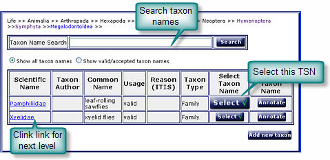 If a new taxon name needs to be added select the Add New Taxon button that is visible from the family level. The Add Taxonomic Name screen will popup. (This option is only available for authorized users.) For complete instructions on this process see the ITIS, Add Taxon Name section of this manual. - Determined By
